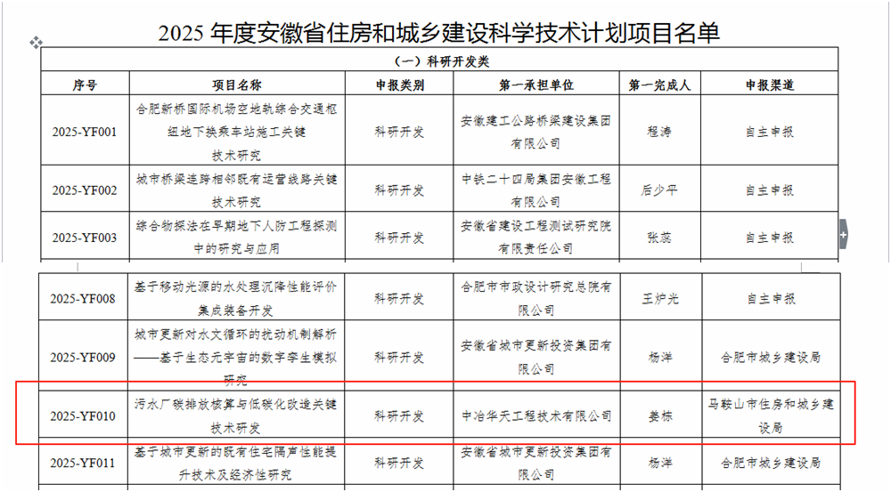 近日,安徽省住房和城鄉(xiāng)建設(shè)廳公布2025年度住房城鄉(xiāng)建設(shè)科學(xué)技術(shù)計(jì)劃項(xiàng)目名單,中冶華天申報(bào)的“污水廠碳排放核算與低碳化改造關(guān)鍵技術(shù)研發(fā)”成功獲批立項(xiàng)。這是繼參編《溫室氣體排放核算與報(bào)告要求:生活污水處理企業(yè)》國家標(biāo)準(zhǔn)后,中冶華天水環(huán)境科研設(shè)計(jì)團(tuán)隊(duì)在傳統(tǒng)污水廠低碳改造技術(shù)攻關(guān)上的新起點(diǎn),集中展現(xiàn)了中冶華天的環(huán)??蒲袑?shí)力與央企責(zé)任擔(dān)當(dāng)。