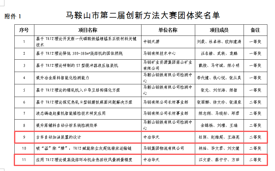 日前,由馬鞍山市科協(xié)、馬鞍山市總工會(huì)主辦的以“因創(chuàng)而聚,向新而行”為主題的馬鞍山市第二屆創(chuàng)新方法大賽決賽圓滿落幕,中冶華天《應(yīng)用TRIZ理論提高燒結(jié)環(huán)冷機(jī)余熱回收風(fēng)量測(cè)量精度》和《臺(tái)車自動(dòng)加油裝置的設(shè)計(jì)》兩個(gè)項(xiàng)目榮獲大賽團(tuán)體二等獎(jiǎng),集中展現(xiàn)了其科研創(chuàng)新實(shí)力和一線科技工作者的自主創(chuàng)新水平。